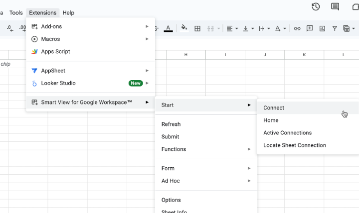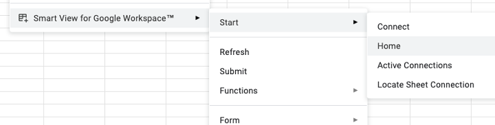 The connection process remains the same as described in my previous posts. Navigate to Extensions → Smart View for Google Workspace™ → Start → Connect.