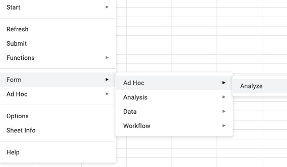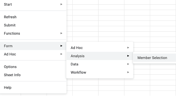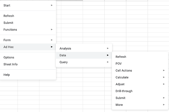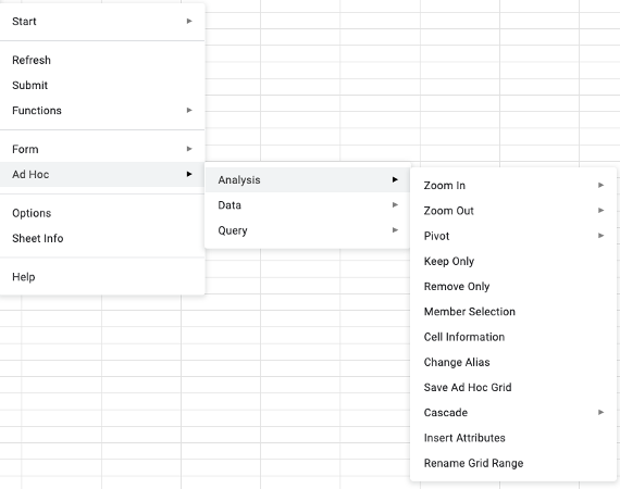 As you can tell, using Smart View in Google Sheets to do analysis involves a LOT of menu navigation. You have to drill through multiple layers of submenus to get to the action you need. This is one of the key differences compared to the PC version, where many of these options are available via the ribbon or right-click context menus.